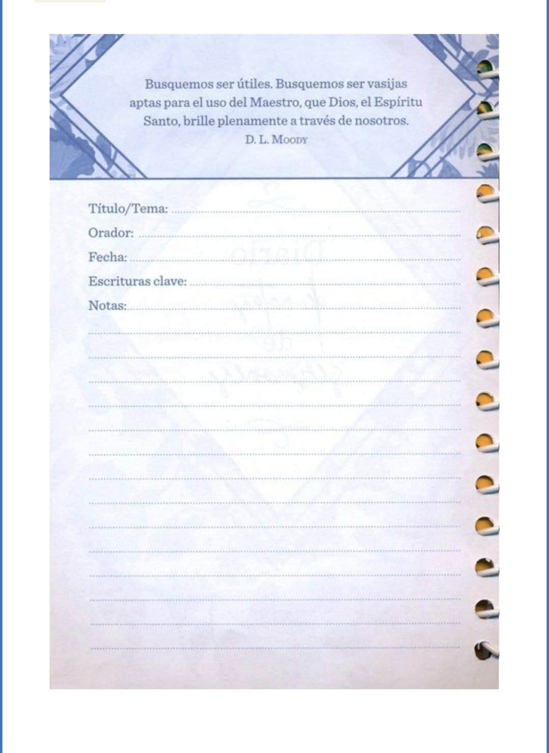 Este diario es una herramienta esencial para tu crecimiento espiritual, diseñada para ayudarte a capturar y organizar las enseñanzas de cada sermón. Con páginas cuidadosamente diseñadas, tendrás espacio para anotar detalles importantes y reflexiones personales.