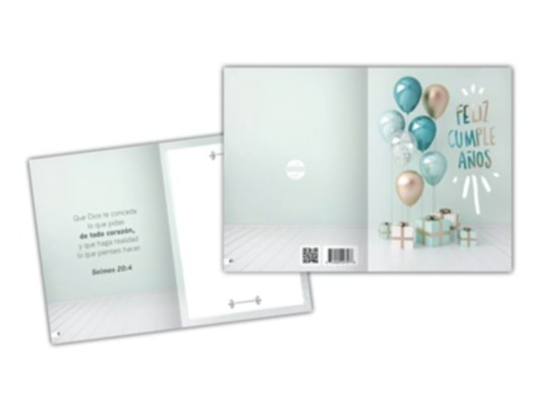 Esta tarjeta de cumpleaños es perfecta para transmitir un mensaje de bendición y esperanza. Su diseño incluye globos y regalos, y en su interior lleva el inspirador versículo de Salmo 20:4: "Que Dios te conceda lo que pidas de todo corazón, y que haga realidad lo que pienses hacer". Es una manera significativa de honrar a alguien en su día especial.