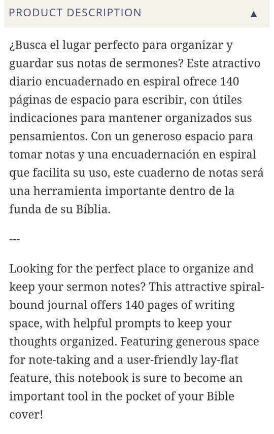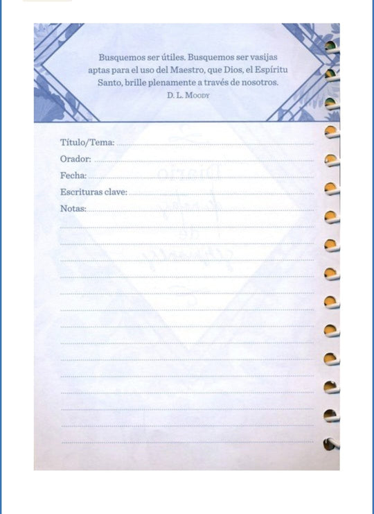 Este diario es una herramienta esencial para tu crecimiento espiritual, diseñada para ayudarte a capturar y organizar las enseñanzas de cada sermón. Con páginas cuidadosamente diseñadas, tendrás espacio para anotar detalles importantes y reflexiones personales. Cada...Regular price $8.99Regular price $8.99 -