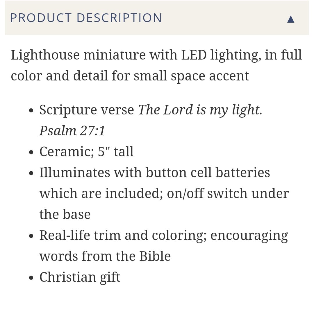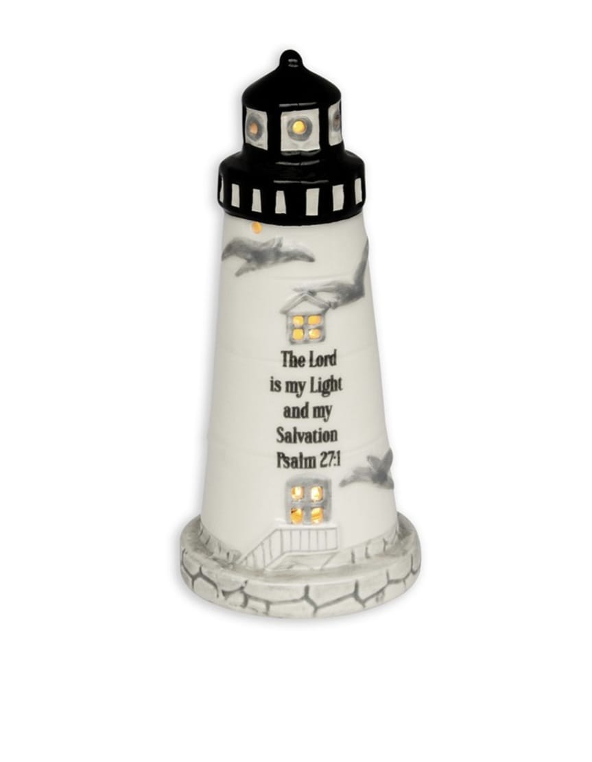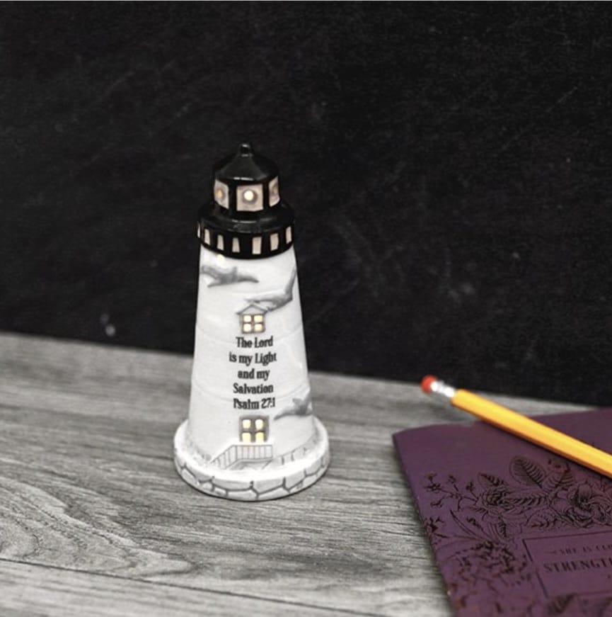 Esta mini lámpara con forma de faro es un recordatorio visual del poder y la guía de Dios en tu vida. Inspirada en el versículo bíblico de Salmo 27:1, "El Señor es mi luz y mi salvación", esta pieza de decoración es ideal para cualquier espacio del hogar, oficina o iglesia.