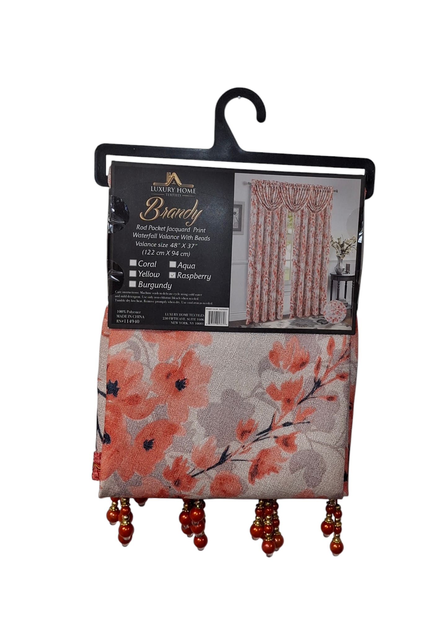 Enhance your home décor with the elegant Brandy Rod Pocket Jacquard Print Waterfall Valance with Beads. This 48"X37" valance features a beautiful jacquard print in a vibrant raspberry color, adding a touch of sophistication to any room. The rod pocket design allows for easy installation, while the waterfall style and bead embellishments provide a stylish and unique finish.