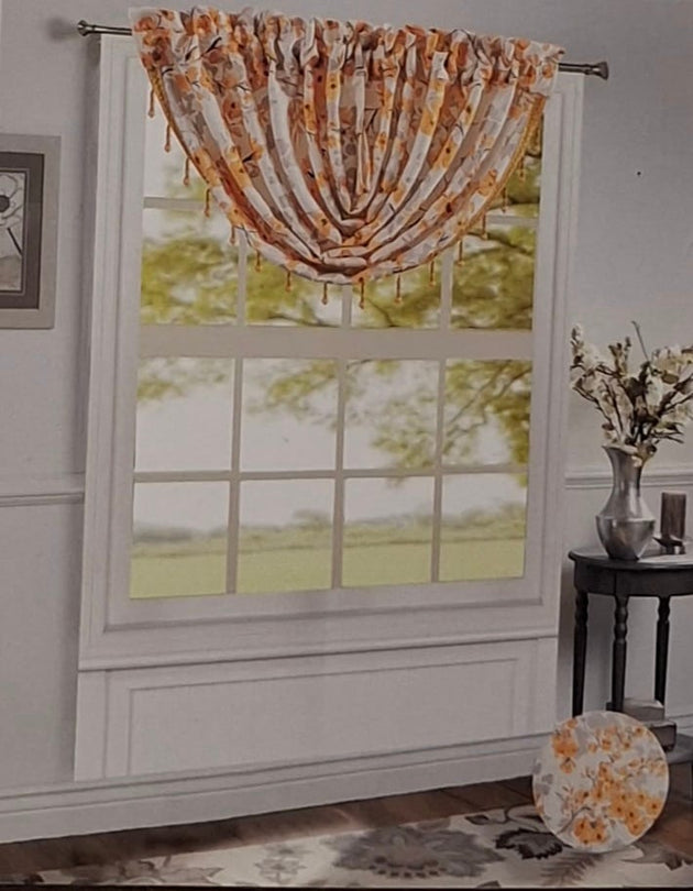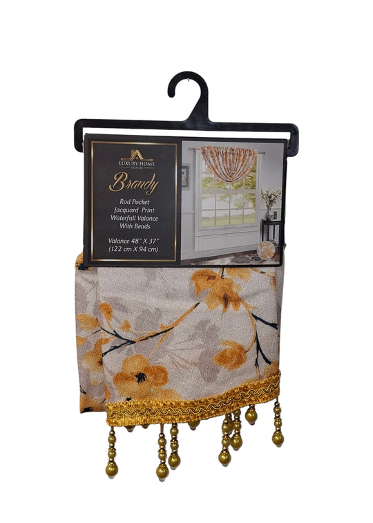 Brandy Rod Pocket Jacquard Print Waterfall Valance with Beads. Yellow
