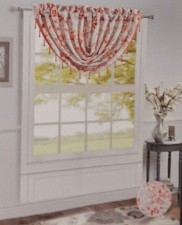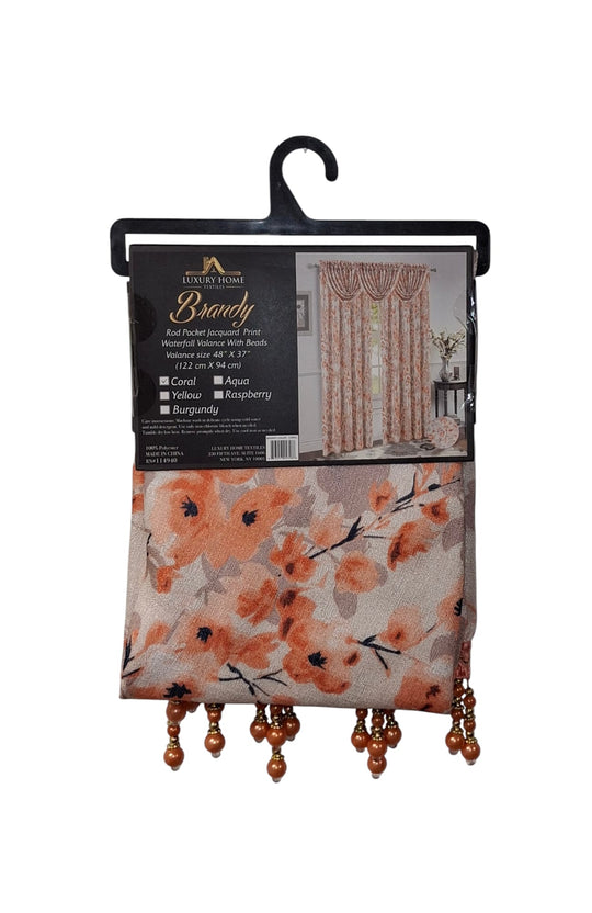 Brandy Rod Pocket Jacquard Print Waterfall Valance with Beads. Coral